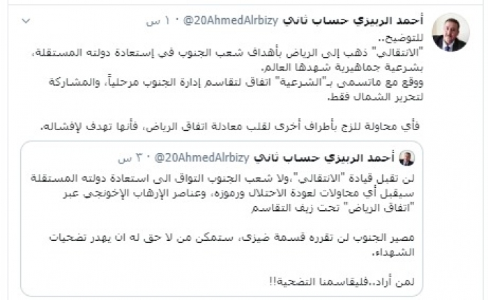 وكتب "الربيزي" في تغريدة عبر حسابه بتويتر، رصدها "المشهد العربي": "لن تقبل قيادة "الانتقالي"، ولا شعب الجنوب التواق إلى استعادة دولته المستقلة أي محاولات لعودة الاحتلال ورموزه، وعناصر الإرهاب الإخونجي عبر "اتفاق الرياض" تحت زيف التقاسم".