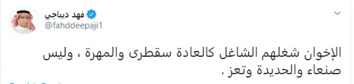 وقال في تغريدة عبر "تويتر" رصدها "المشهد العربي": "الإخوان شغلهم الشاغل كالعادة سقطرى والمهرة ، وليس صنعاء والحديدة وتعز".