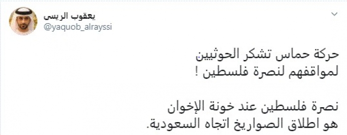 وقال في تغريدة عبر "تويتر" رصدها "المشهد العربي": "حركة حماس تشكر الحوثيين لمواقفهم لنصرة فلسطين! نصرة فلسطين عند خونة الإخوان هو إطلاق الصواريخ اتجاه السعودية".