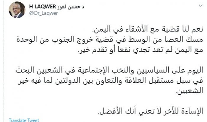 وقال في تغريدة عبر "تويتر" رصدها "المشهد العربي": "نعم لنا قضية مع الأشقاء في اليمن. مسك العصا من الوسط في قضية خروج الجنوب من الوحدة مع اليمن لم تعد تجدي نفعًا أو تقدم خير".