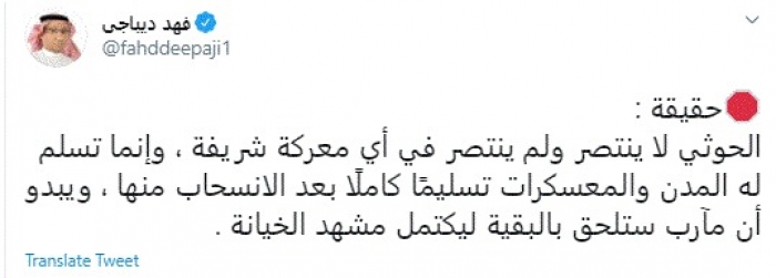 وكتب في تغريدة عبر "تويتر" رصدها "المشهد العربي": "الحوثي لا ينتصر ولم ينتصر في أي معركة شريفة، وإنما تسلم له المدن والمعسكرات تسليمًا كاملًا بعد الانسحاب منها".