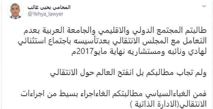 وقال في تغريدة عبر "تويتر" رصدها "المشهد العربي": "طالبتم المجتمع الدولي والإقليمي والجامعة العربية بعدم التعامل مع المجلس الانتقالي بعد تأسيسه باجتماع استثنائي لهادي ونائبه ومستشاريه نهاية مايو2017م ولم تجاب مطالبكم بل انفتح العالم حول الانتقالي".