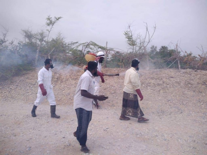 شهدت مديرية المسيلة في محافظة المهرة، اليوم الأحد، أعمال رش لمكافحة أسراب الجراد في مزارع المديرية.