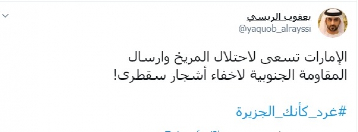وكتب عبر تغريدة له على "تويتر" رصدها "المشهد العربي": "الإمارات تسعى لاحتلال المريخ وإرسال المقاومة الجنوبية لإخفاء أشجار سقطرى".