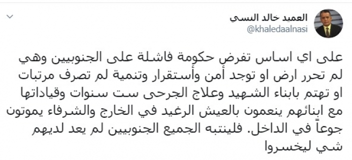هاجم الكاتب والمحلل العسكري، العميد خالد النسي، اليوم الأحد، حكومة الشرعية، مؤكدا أنها حكومة فاشلة لم تستطع تحرير الأرض أو فرض الأمن والاستقرار والتنمية.