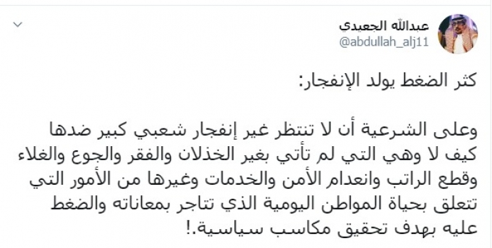 وكتب عبر تغريدة له على "تويتر" رصدها "المشهد العربي": "كثر الضغط يولد الانفجار، وعلى الشرعية أن لا تنتظر غير انفجار شعبي كبير ضدها، كيف لا وهي التي لم تأت بغير الخذلان والفقر والجوع والغلاء وقطع الراتب وانعدام الأمن والخدمات وغيرها من الأمور التي تتعلق بحياة المواطن اليومية الذي تتاجر بمعاناته والضغط عليه بهدف تحقيق مكاسب سياسية".
