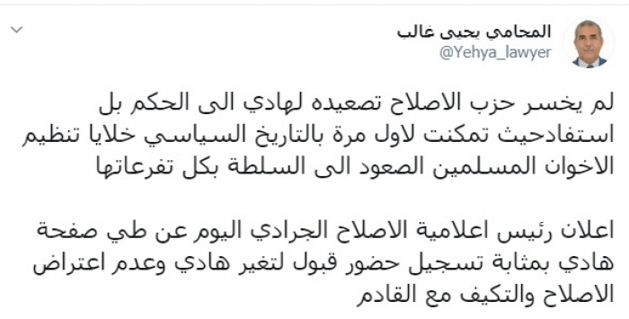 وكتب عبر تغريدة له على "تويتر" رصدها "المشهد العربي": "لم يخسر حزب الإصلاح تصعيده لهادي إلى الحكم بل استفاد حيث تمكنت لأول مرة بالتاريخ السياسي خلايا تنظيم الإخوان المسلمين الصعود إلى السلطة بكل تفرعاتها، إعلان رئيس إعلامية الإصلاح الجرادي اليوم عن طي صفحة هادي بمثابة تسجيل حضور قبول لتغير هادي وعدم اعتراض الإصلاح والتكيف مع القادم.