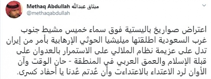 وقال في تغريدة عبر "تويتر" رصدها "المشهد العربي": "اعتراض صواريخ باليستية فوق سماء خميس مشيط جنوب غرب السعودية اطلقتها مليشيا الحوثي الإرهابية بأمر من إيران تدل على عزيمة نظام الملالي على الاستمرار بالعدوان على قبلة الإسلام والعمق العربي في المنطقة".
