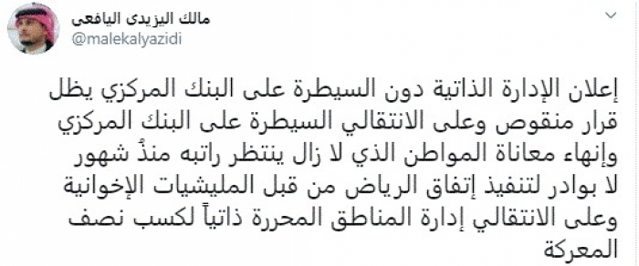وقال في تغريدة عبر "تويتر" رصدها "المشهد العربي": "إعلان الإدارة الذاتية دون السيطرة على البنك المركزي يظل قرار منقوص وعلى الانتقالي السيطرة على البنك المركزي وإنهاء معاناة المواطن الذي لا زال ينتظر راتبه منذُ شهور".