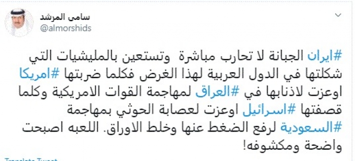 وقال في تغريدة عبر "تويتر" رصدها "المشهد العربي": "إيران الجبانة لا تحارب مباشرة وتستعين بالمليشيات التي شكلتها في الدول العربية لهذا الغرض".