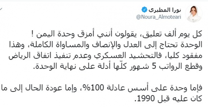 وكتبت عبر تغريدة لها على "تويتر" رصدها "المشهد العربي": "كل يوم ألف تعليق، يقولون إنني أمزق وحدة اليمن، الوحدة تحتاج إلى العدل والإنصاف والمساواة الكاملة، وهذا مفقود كليا، فالتحشيد العسكري وعدم تنفيذ اتفاق الرياض وقطع الرواتب 5 شهور كلّها أدلة على نهاية الوحدة".