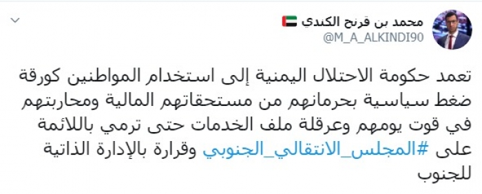 وكتب عبر تغريدة له على "تويتر" رصدها " المشهد العربي": "تعمد حكومة الاحتلال اليمنية إلى استخدام المواطنين كورقة ضغط سياسية بحرمانهم من مستحقاتهم المالية ومحاربتهم في قوت يومهم وعرقلة ملف الخدمات حتى ترمي باللائمة على المجلس الانتقالي الجنوبي وقراره بالإدارة الذاتية للجنوب".