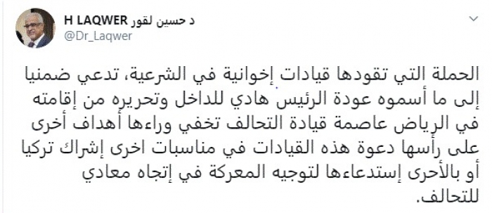 وقال في تغريدة عبر "تويتر" رصدها "المشهد العربي": "الحملة التي تقودها قيادات إخوانية في الشرعية، تدعي ضمنيًا إلى ما أسموه عودة الرئيس هادي للداخل وتحريره من إقامته في الرياض عاصمة قيادة التحالف تخفي وراءها أهداف أخرى".