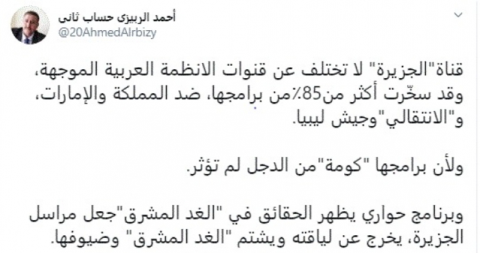 الربيزي مُهاجمًا الجزيرة: تروج الأكاذيب.. وبرامجها أصبحت غير مؤثرة