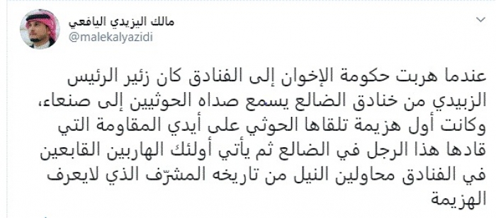 وقال في تغريدة عبر "تويتر" رصدها "المشهد العربي": "عندما هربت حكومة الإخوان إلى الفنادق كان زئير الرئيس الزُبيدي من خنادق الضالع يسمع صداه الحوثيين إلى صنعاء".
