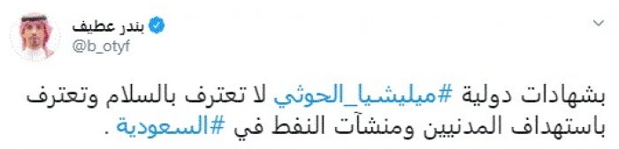 وقال في تغريدة عبر "تويتر" رصدها "المشهد العربي": "بشهادات دولية مليشيا الحوثي لا تعترف بالسلام وتعترف باستهداف المدنيين ومنشآت النفط في السعودية".