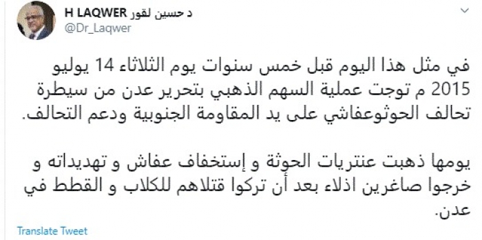 وقال في تغريدة عبر "تويتر" رصدها "المشهد العربي": "في مثل هذا اليوم قبل خمس سنوات يوم الثلاثاء 14 يوليو 2015 م توجت عملية السهم الذهبي بتحرير عدن من سيطرة تحالف الحوثوعفاشي على يد المقاومة الجنوبية ودعم التحالف".