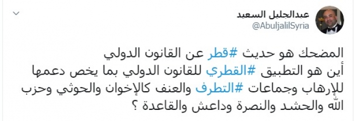 وكتب عبر تغريدة له على "تويتر" رصدها "المشهد العربي": "المضحك هو حديث قطر عن القانون الدولي، أين هو التطبيق القطري للقانون الدولي بما يخص دعمها للإرهاب وجماعات التطرف والعنف كالإخوان والحوثي وحزب الله والحشد والنصرة وداعش والقاعدة؟".