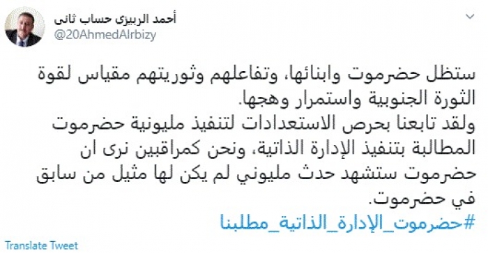 وقال في تغريدة عبر "تويتر" رصدها "المشهد العربي": "ستظل حضرموت وأبنائها، وتفاعلهم وثوريتهم مقياس لقوة الثورة الجنوبية واستمرار وهجها".