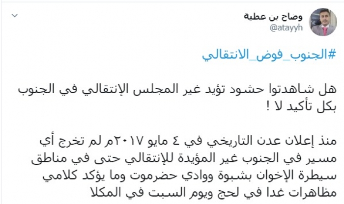 وأضاف: "منذ إعلان عدن التاريخي في4 مايو 2017م لم تخرج أي مسيرة في الجنوب غير المؤيدة للانتقالي حتى في مناطق سيطرة الإخوان بشبوة ووادي حضرموت وما يؤكد كلامي مظاهرات غد في لحج ويوم السبت في المكلا".