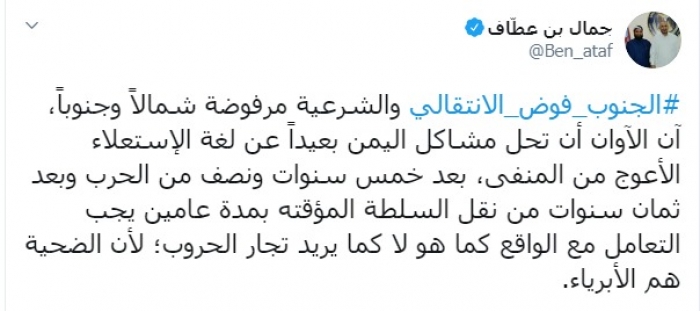وكتب عبر تغريدة له على "تويتر" رصدها "المشهد العربي": "الجنوب فوض الانتقالي والشرعية مرفوضة شمالا وجنوبا، آن الأوان أن تحل مشاكل اليمن بعيدا عن لغة الاستعلاء الأعوج من المنفى، بعد خمس سنوات ونصف من الحرب وبعد ثماني سنوات من نقل السلطة المؤقتة بمدة عامين يجب التعامل مع الواقع كما هو لا كما يريد تجار الحروب؛ لأن الضحية هم الأبرياء".
