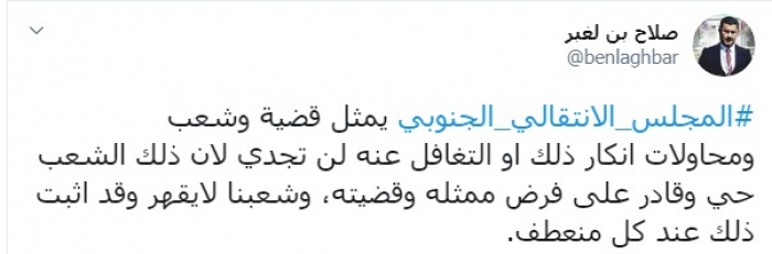 وكتب عبر تغريدة له على "تويتر" رصدها "المشهد العربي": "المجلس الانتقالي الجنوبي يمثل قضية وشعب، ومحاولات إنكار ذلك أو التغافل عنه لن تجدي لأن ذلك الشعب حي وقادر على فرض ممثله وقضيته، وشعبنا لا يقهر وقد أثبت ذلك عند كل منعطف".