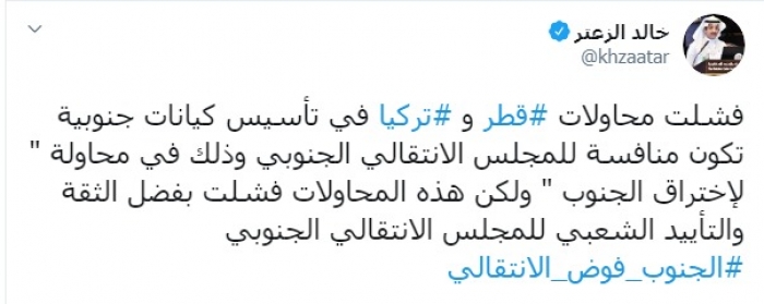 وكتب عبر تغريدة له على "تويتر" رصدها "المشهد العربي": "فشلت محاولات قطر وتركيا في تأسيس كيانات جنوبية تكون منافسة للمجلس الانتقالي الجنوبي وذلك في محاولة "لاختراق الجنوب" ولكن هذه المحاولات فشلت بفضل الثقة والتأييد الشعبي للمجلس الانتقالي الجنوبي".