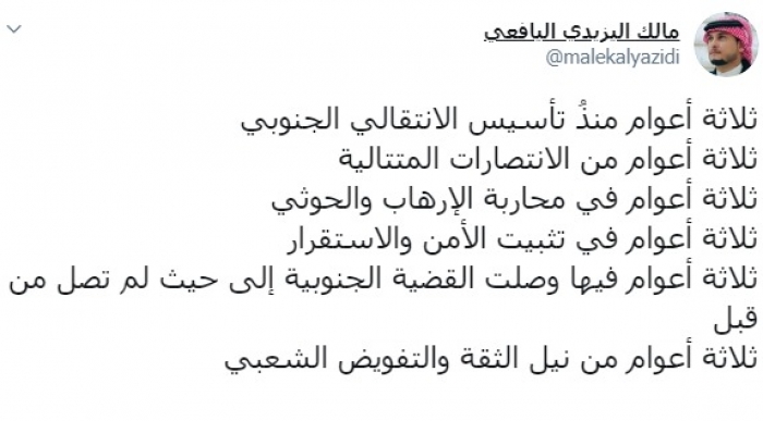 وكتب عبر تغريدة له على "تويتر" رصدها "المشهد العربي": "ثلاثة أعوام منذُ تأسيس الانتقالي الجنوبي، ثلاثة أعوام من الانتصارات المتتالية، ثلاثة أعوام في محاربة الإرهاب والحوثي، ثلاثة أعوام في تثبيت الأمن والاستقرار، ثلاثة أعوام فيها وصلت القضية الجنوبية إلى حيث لم تصل من قبل، ثلاثة أعوام من نيل الثقة والتفويض الشعبي".