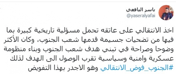 وكتب عبر تغريدة له على "تويتر" رصدها " المشهد العربي": "أخذ الانتقالي على عاتقه تحمل مسؤولية تاريخية كبيرة بما فيها من تضحيات جسيمة قدمها شعب الجنوب، وكان الأكثر وضوحا وصراحة في تبني هدف شعب الجنوب وبناء منظومة عسكرية وأمنية وسياسية تقرب الوصول إلى الهدف لذلك الجنوب فوض الانتقالي وهو الأجدر بهذا التفويض".