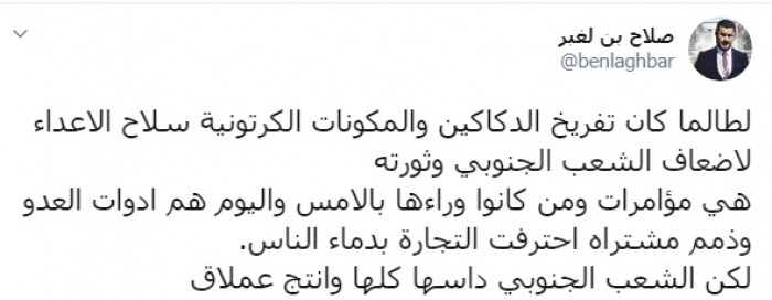 وكتب عبر تغريدة له على "تويتر" رصدها " المشهد العربي": "لطالما كان تفريخ الدكاكين والمكونات الكرتونية، سلاح الاعداء لإضعاف الشعب الجنوبي وثورته، هي مؤامرات ومن كانوا وراءها بالأمس واليوم هم أدوات العدو وذمم مشتراه احترفت التجارة بدماء الناس، لكن الشعب الجنوبي داسها كلها وأنتج عملاق المجلس الانتقالي".