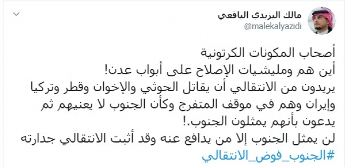 وكتب عبر تغريدة له على "تويتر" رصدها "المشهد العربي": "أصحاب المكونات الكرتونية أين هم ومليشيات الإصلاح على أبواب عدن، يريدون من الانتقالي أن يقاتل الحوثي والإخوان وقطر وتركيا وإيران وهم في موقف المتفرج وكأن الجنوب لا يعنيهم ثم يدعون بأنهم يمثلون الجنوب".