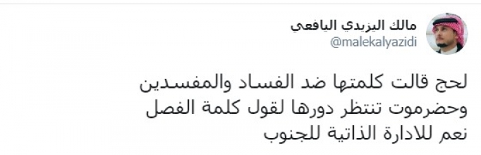 وكتب عبر تغريدة له على "تويتر" رصدها " المشهد العربي": "لحج قالت كلمتها ضد الفساد والمفسدين، وحضرموت تنتظر دورها لقول كلمة الفصل نعم للإدارة الذاتية للجنوب".