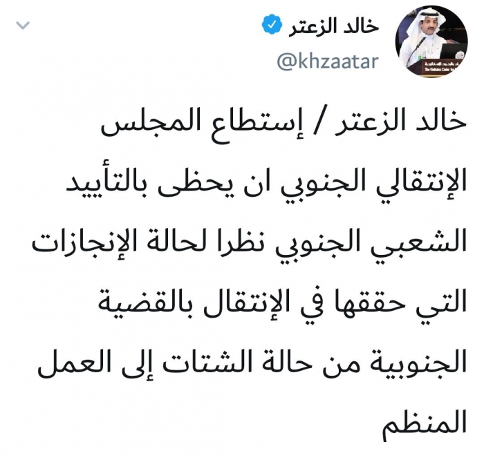 وكتب "الزعتر" في تغريدة عبر حسابه الشخصي بتويتر، رصدها "المشهد العربي": "استطاع المجلس الانتقالي الجنوبي أن يحظى بالتأييد الشعبي الجنوبي نظرا لحالة الإنجازات التي حققها في الانتقال بالقضية الجنوبية من حالة الشتات إلى العمل المنظم".