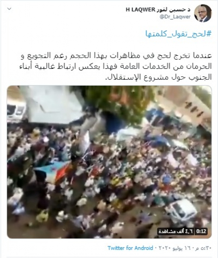 وكتب "لقور" في تغريدة بحسابه الشخصي بتويتر، رصدها "المشهد العربي": "عندما تخرج لحج في مظاهرات بهذا الحجم رغم التجويع والحرمان من الخدمات العامة فهذا يعكس ارتباط غالبية أبناء الجنوب حول مشروع الاستقلال".