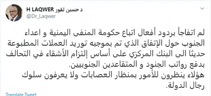 وقال في تغريدة عبر "تويتر" رصدها "المشهد العربي": "لم اتفاجئ بردود أفعال أتباع حكومة المنفى اليمنية وأعداء الجنوب حول الاتفاق الذي تم بموجبه توريد العملات المطبوعة حديثًا إلى البنك المركزي على أساس التزام الأشقاء في التحالف بدفع رواتب الجنود المتقاعدين الجنوبيين".