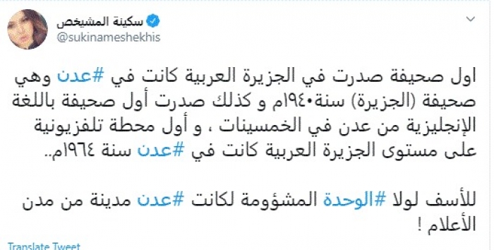 وكتبت في تغريدة عبر "تويتر" رصدها "المشهد العربي": "أول صحيفة صدرت في الجزيرة العربية كانت في عدن وهي صحيفة (الجزيرة) سنة 1940م و كذلك صدرت أول صحيفة باللغة الإنجليزية من عدن في الخمسينات، وأول محطة تلفزيونية على مستوى الجزيرة العربية كانت في عدن سنة 1964م".