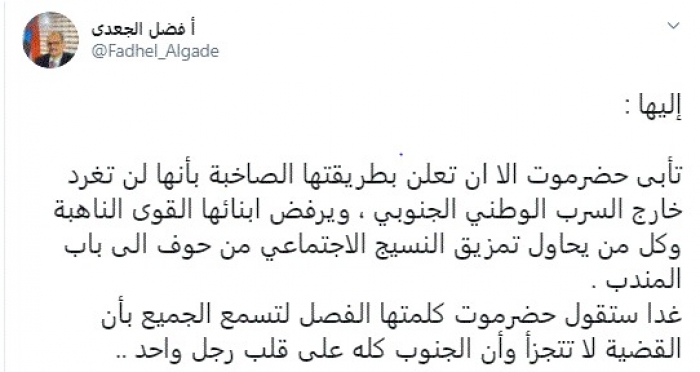 وكتب في تغريدة عبر "تويتر" رصدها "المشهد العربي": "تأبى حضرموت ألا أن تعلن بطريقتها الصاخبة بأنها لن تغرد خارج السرب الوطني الجنوبي".