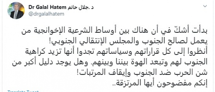 وكتب في تغريدة عبر "تويتر" رصدها "المشهد العربي": "بدأت أشكّ في أن هناك بين أوساط الشرعية الإخوانجية من يعمل لصالح الجنوب والمجلس الإنتقالي الجنوبي".