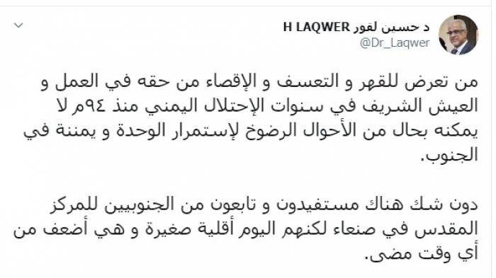 وكتب عبر تغريدة له على "تويتر" رصدها "المشهد العربي": "من تعرض للقهر والتعسف والإقصاء من حقه في العمل والعيش الشريف في سنوات الاحتلال اليمني منذ ٩٤م لا يمكنه بحال من الأحوال الرضوخ لاستمرار الوحدة و اليمننة في الجنوب".