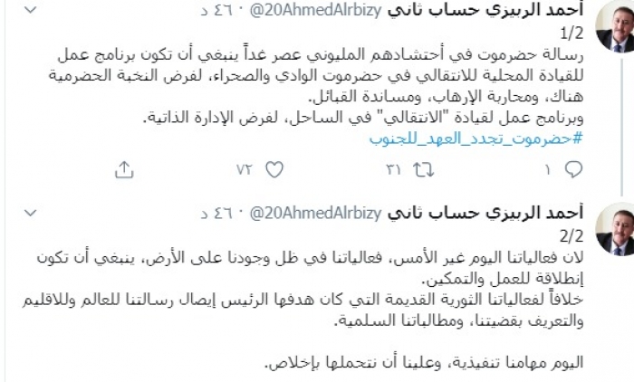 وكتب عبر تغريدات له على "تويتر" رصدها "المشهد العربي": "رسالة حضرموت في احتشادهم المليوني عصر غد ينبغي أن تكون برنامج عمل للقيادة المحلية للانتقالي في حضرموت الوادي والصحراء، لفرض النخبة الحضرمية هناك، ومحاربة الإرهاب، ومساندة القبائل، وبرنامج عمل لقيادة "الانتقالي" في الساحل، لفرض الإدارة الذاتية".