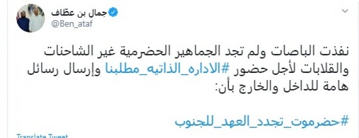 وكتب في تغريدة عبر "تويتر" رصدها "المشهد العربي": "نفذت الباصات ولم تجد الجماهير الحضرمية غير الشاحنات والقلابات لأجل حضور الإدارة الذاتية مطلبنا وإرسال رسائل هامة للداخل والخارج بأن: حضرموت تجدد العهد للجنوب".