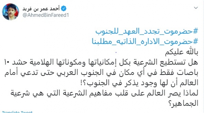بعد الحشود الغفيرة المؤيدة للانتقالي.. بن فريد يوجه سؤالًا محرجًا للشرعية