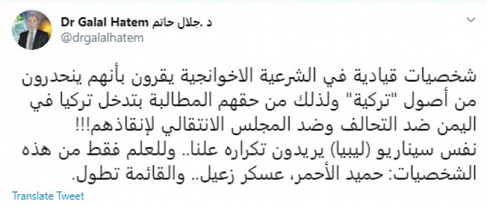 هاجم الأكاديمي الجنوبي رئيس جامعة "أم القيوين" الإماراتية الدكتور جلال حاتم، اليوم، بعض قيادات حكومة الشرعية جراء مطالبتهم بتدخل تركيا في اليمن، وتكرار ما حدث في ليبيا باليمن.