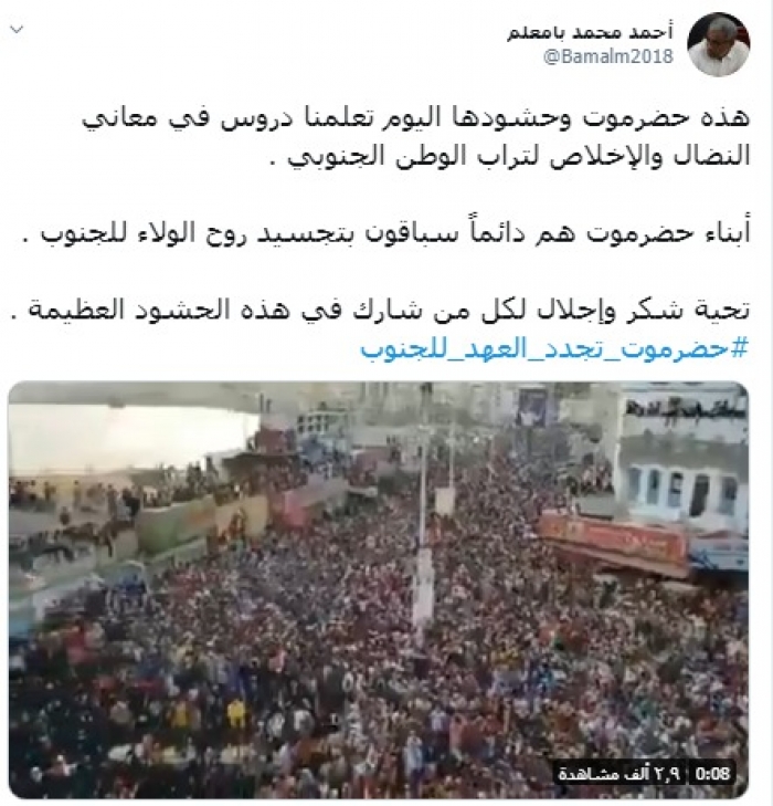 وكتب "بامعلم" في تغريدة بتويتر، رصدها "المشهد العربي": "هذه حضرموت وحشودها اليوم تعلمنا دروس في معاني النضال والإخلاص لتراب الوطن الجنوبي" .