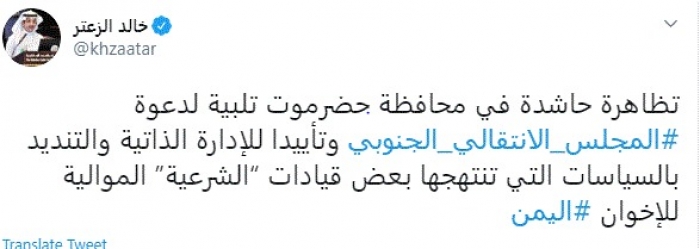 وقال في تغريدة عبر "تويتر" رصدها "المشهد العربي": "تظاهرة حاشدة في محافظة حضرموت تلبية لدعوة المجلس الانتقالي الجنوبي وتأييدًا للإدارة الذاتية".