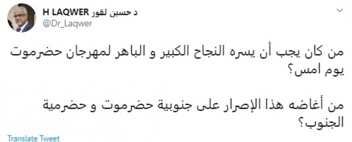 وقال في تغريدة عبر "تويتر" رصدها "المشهد العربي": "من كان يجب أن يسره النجاح الكبير والباهر لمهرجان حضرموت يوم أمس؟".