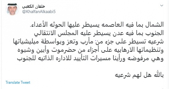 مرفوضة في الجنوب.. الكعبي يشن أعنف هجوم على الشرعية