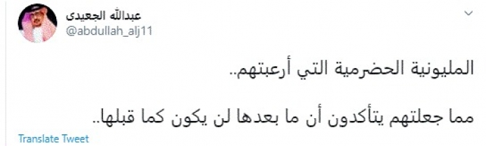 وقال في تغريدة عبر "تويتر" رصدها "المشهد العربي": "المليونية الحضرمية التي أرعبتهم.. مما جعلتهم يتأكدون أن ما بعدها لن يكون كما قبلها".