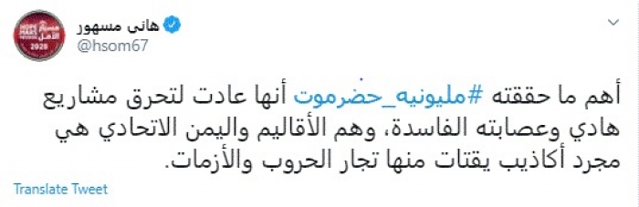وكتب في تغريدة عبر "تويتر" رصدها "المشهد العربي": "أهم ما حققته مليونية حضرموت أنها عادت لتحرق مشاريع هادي وعصابته الفاسدة، وهم الأقاليم واليمن الاتحادي هي مجرد أكاذيب يقتات منها تجار الحروب والأزمات".
