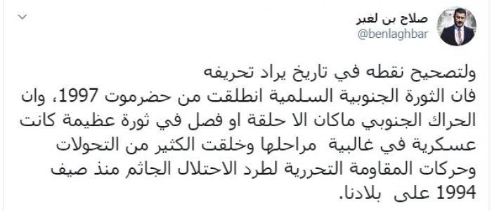 وكتب عبر تغريدة له على "تويتر" رصدها "المشهد العربي": "ولتصحيح نقطة في تاريخ يراد تحريفه فإن الثورة الجنوبية السلمية انطلقت من حضرموت 1997، وإن الحراك الجنوبي ما كان إلا حلقة أو فصلا في ثورة عظيمة كانت عسكرية في غالبية مراحلها وخلقت الكثير من التحولات وحركات المقاومة التحررية لطرد الاحتلال الجاثم منذ صيف 1994 على بلادنا".